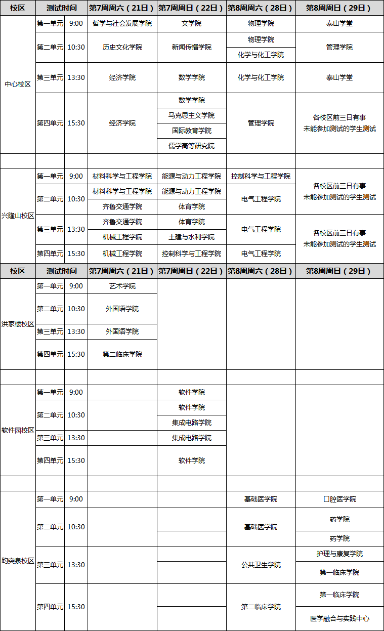 由各学院辅导员组织,按照设定时间通知学生集中测试,测试时间第七周、第八周周末(10月21日-22日;10月28日-29日),具体安排见下表。