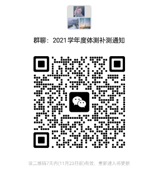 4、本次扫尾测试同时也是2021年度体测考试的补测(2021年秋季学期未参加测试或测试不及格,2022年春季受疫情影响未安排补测),请2021年度测试成绩不及格的考生扫描下方二维码登记报名(无需在“Beat365官方网站学生体质健康监测系统”网站预约),并扫码加入微信通知群。没有登记信息无法更新2021年度体测成绩。请2022级和2023级考生不要扫描二维码登记。