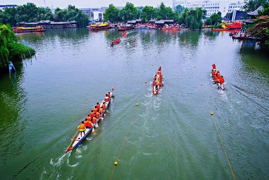 “宏济堂阿胶杯”济南第六届大明湖端午节龙舟赛18日上午在济南大明湖开幕,来自省内9家单位14支代表队参加了激烈角逐。比赛开始前,山大龙舟队的同学们就已经按捺不住内心的激动,摩拳擦掌,跃跃欲试。虽然组队后第一次参加大型龙舟赛,但是队员们依旧有条不紊地进行着比赛前的准备活动。随着裁判员的一声哨响,龙舟队的队员们积蓄已久的力量瞬间迸发出来,他们相互配合,伴着阵阵擂鼓向终点起伏冲刺。虽然较职业龙舟队伍,山大并不占优势,但是这丝毫没有影响队员的士气,他们依旧用力的划着,身体前倾,插桨入水,全身用力,划动后拖,每一个动作都将训练过程中教练的教导很完美的演绎着。最终,山大龙舟队在混合组的800米竞速比赛中以2秒之差取得第四名。