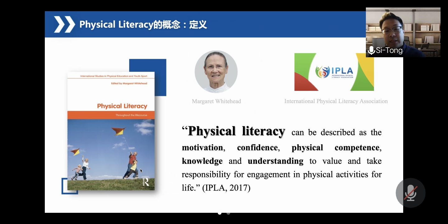 随后,陈思同博士作了题为“Physical Literacy 研究的概况性综述:现状、挑战、未来”的主题报告。陈思同博士表示Physical Literacy 作为促进积极活跃健康生活方式重要途径之一,引起了学者的高度重视和研究兴趣,美国健康和体育教育协会、加拿大Physical Literacy共识声明、澳大利亚体育协会等不同国家、组织对PL有不同的定义,国内对Physical Literacy的本土化解释则包含体育意识、体育知识、体育行为、体育技能、体质水平。随后,陈思同博士就Physical Literacy近十年期刊的发文量、发文国家、人群分类、主题分类、测评工具的现状进行分析,得出目前Physical Literacy的研究人群更倾向于儿童、研究主题更倾向于概念研究等,并提出Physical Literacy测量框架的整体构建、不同人群的测评和干预、如何整合到体育课程之中、如何结合政策进行拓展等建议。